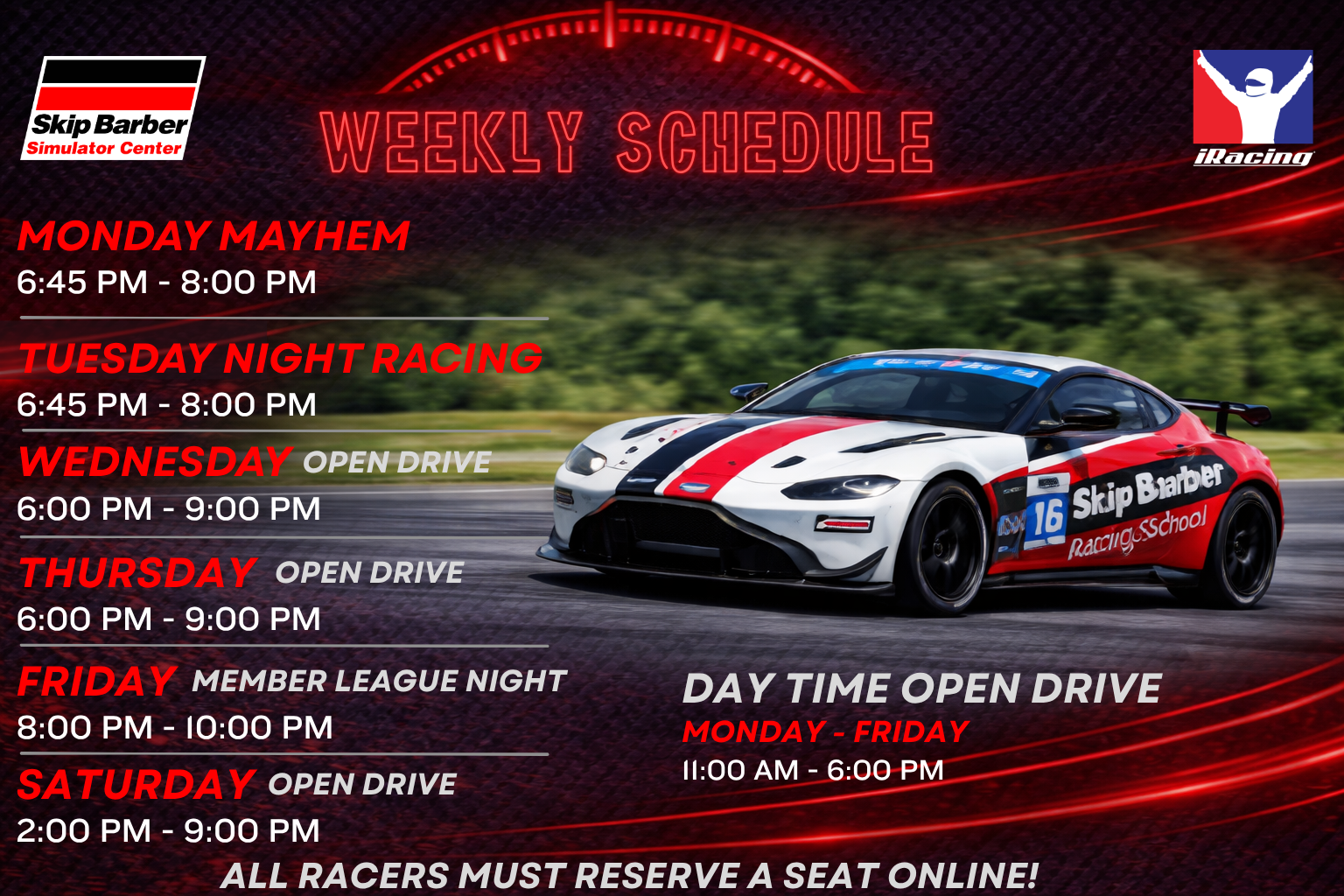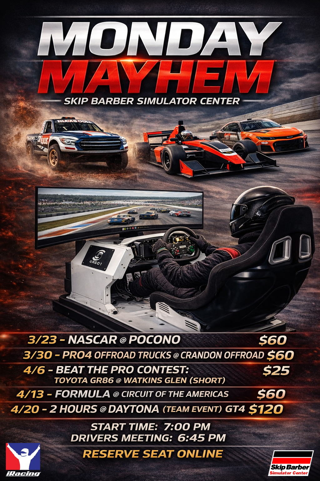 The Skip Barber Sim Center Spring Schedule is built for nonstop action, competition, and variety all week long. Monday Mayhem kicks things off with a constantly changing lineup of adrenaline-pumping experiences—from Beat the Pro shootouts and wild Pro4 Off-Road Trucks to Formula cars at COTA and full 2-hour GT4 endurance battles at Daytona. Tuesday Night Racing delivers intense weekly showdowns in GT4 and GR86, where drivers go head-to-head for bragging rights. Midweek, Wednesday, Thursday, and Saturday open drive sessions give you unlimited opportunity to sharpen your skills and chase faster lap times. Then on Fridays, it’s game on—Member League Night brings the best drivers together for high-stakes, championship-style racing that keeps everyone pushing for the top step of the podium.